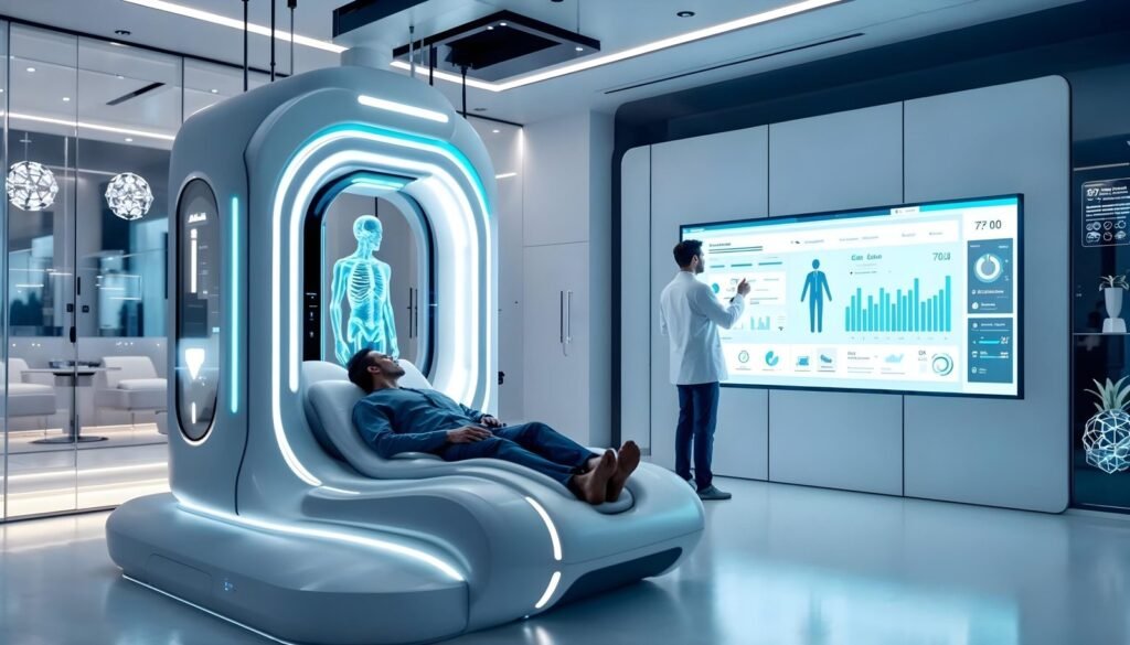 O principal destaque é um scanner corporal avançado que coleta cerca de 50 milhões de dados sobre o corpo humano em apenas 10 minutos. Equipado com mais de 70 sensores, o dispositivo monitora aspectos como frequência cardíaca, microcirculação e saúde da pele. Os dados são processados por um sistema de inteligência artificial, que gera relatórios detalhados sobre a saúde do paciente.